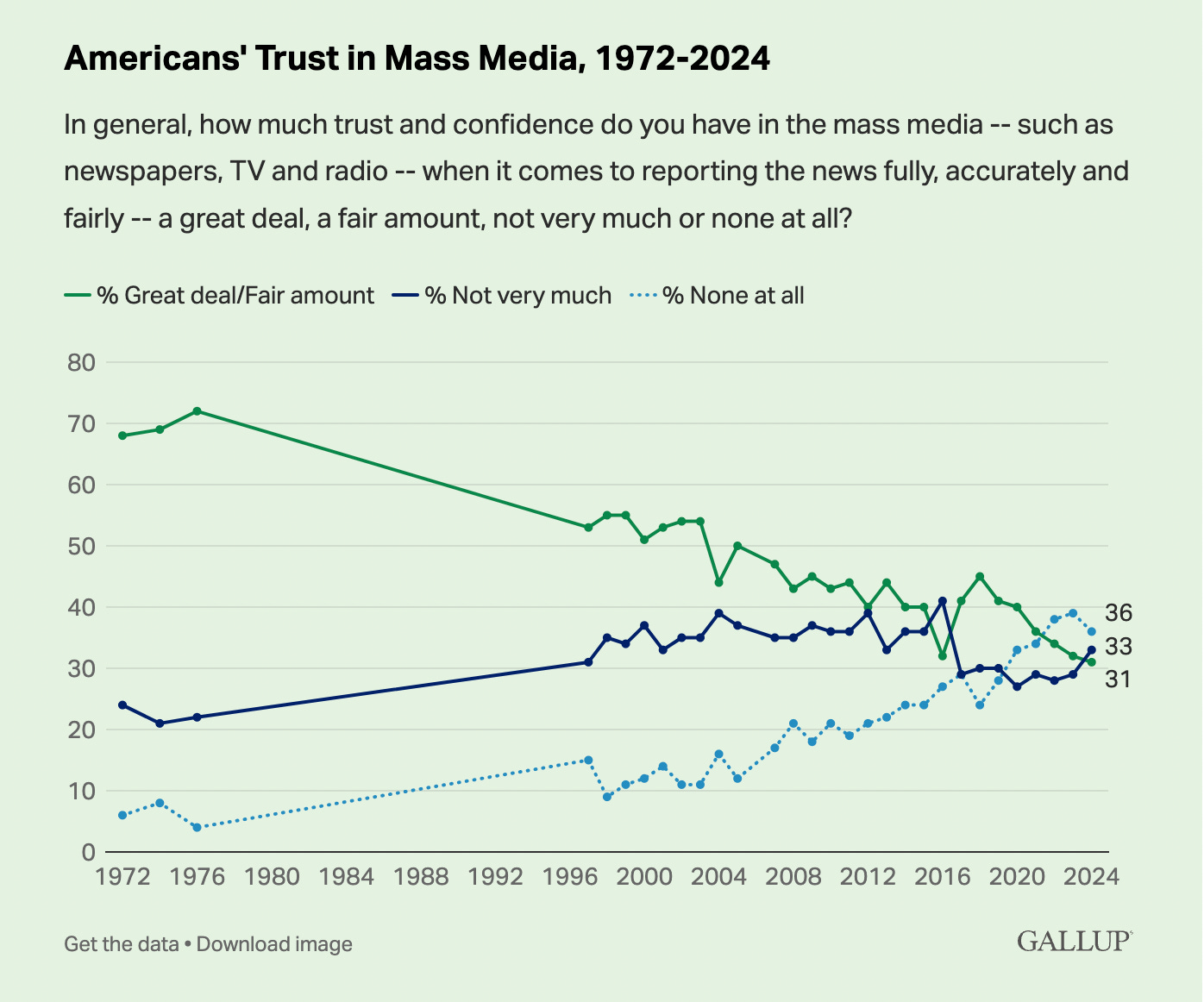 According to Gallup Polls, America's trust in Mass Media is at an all time low of 31%. This is because of the realm of disinformation, deep fakes in AI, misinformation, and fake news that the era of Web2 has brought around with the amount of ways news can be consumed. What Web3 technologies offer, is a solution to combating the issue of distrust in the media.